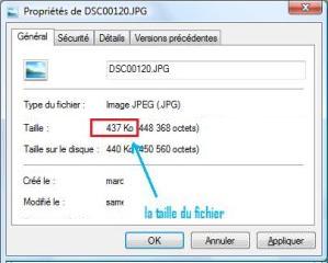 • Dans la fenêtre propriété, lire la taille du fichier en Ko (Kilo Octect) (pour info : 1 Ko = 1024 Octets).